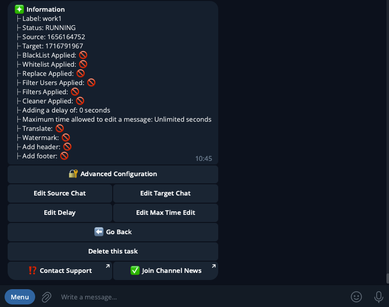 This is list menu for task settings such as **Edit Source Chat, Edit Target Chat or Delete Task or Advanced Configuration and more**