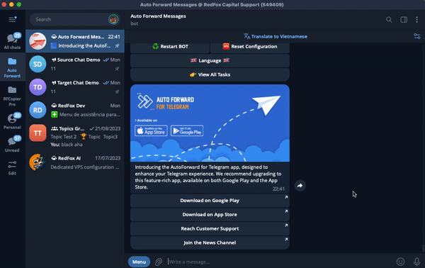 From Telegram open or search [@Auto\_Forward\_Messages\_Bot](https://t.me/Auto_Forward_Messages_Bot) on telegram and select **Show info account** or typing **/profile** then click to **Logout .** All your personal data has been deleted from our server following your request to disconnect from the bot. Thank you
