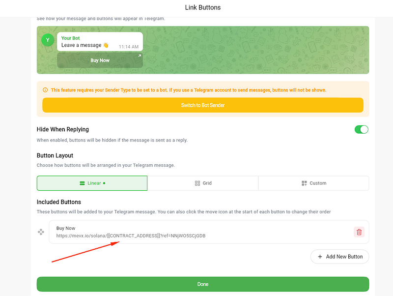 Important: This feature requires Bot Sender. You must use Bot Sender mode in your task βTelegram does not allow link buttons with personal accounts.