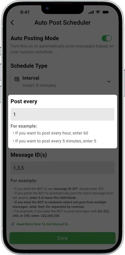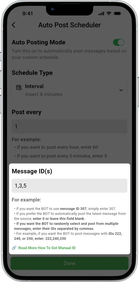* Enter a single ID (e.g., 3) to automatically post that message every (X) minutes