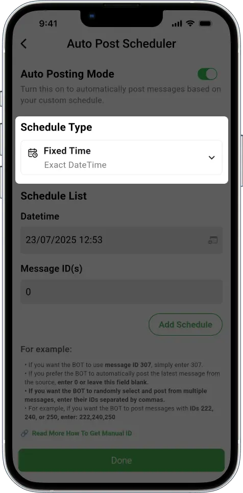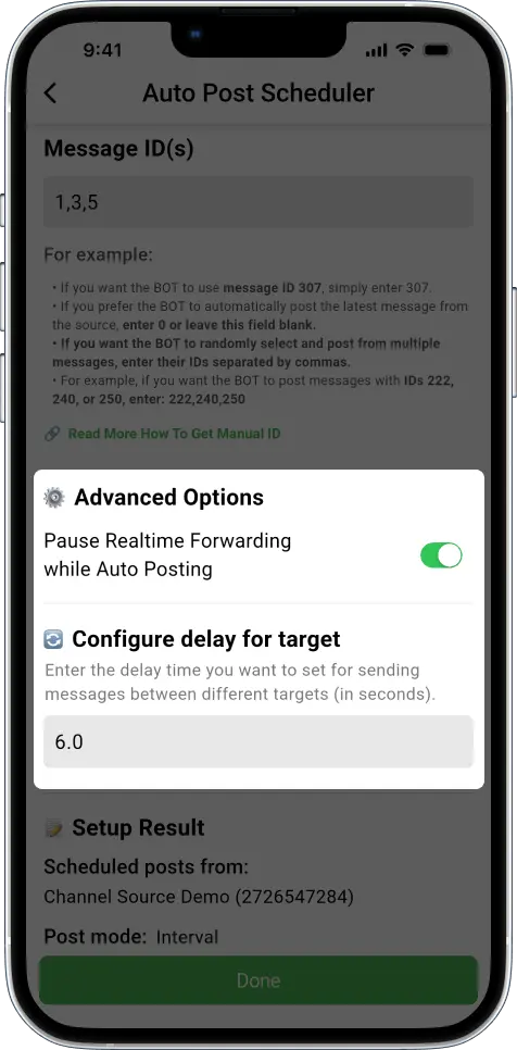 Additionally, make sure the message IDs you use for scheduling come from the source chats you added to the task. The bot can only auto-post messages if their IDs belong to chats already defined as source chats within that specific task.